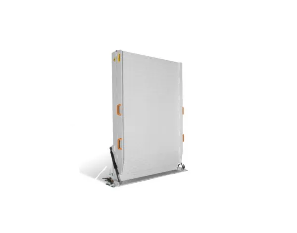 - De opklapbare oprijplaat is geheel voorzien van een gesloten raster platform en heeft recht opstaande zijkanten.